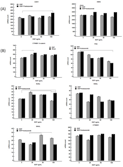 The potential activity of trastuzumab (5 ug/mL) with the increasing-dose combination of EGF (0, 25, 50, 100 ng/mL) on CDH1 and HER2 mRNA expression was evaluated in the HER2-positive human gastric NCI-N87 cell line (Figure 4A). The level of CDH1 mRNA did not change significantly in controls and cells treated with EGF, except in the case of cells treated with the lowest EGF concentration (25 ng/mL). However, the expression of CDH1 was upregulated proportionally in cells treated with an increased concentration of EGF plus trastuzumab. The addition of trastuzumab produced a slight augmentation of HER2 mRNA expression levels in all treated samples.