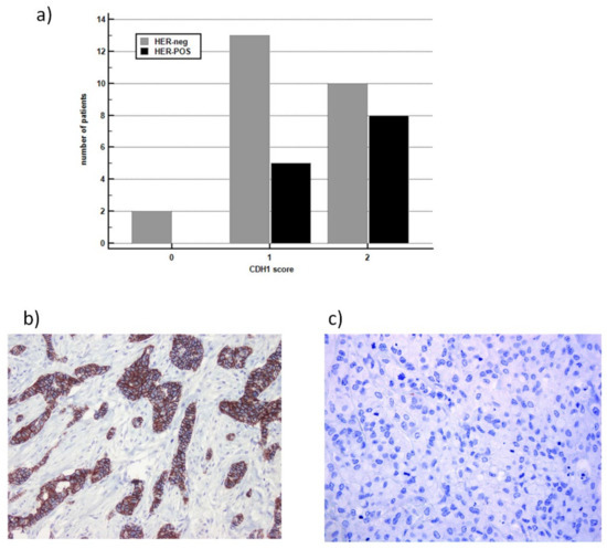 To better understand the role of CDH1/E-CAD expression in HER2-positive (HER-POS) mGC, we have used immunohistochemistry in formalin-fixed paraffin-embedded gastric tissues (n = 38). (a) In the HER-POS group, no patients showed missing E-CAD in the tumor cells (score 0), five patients showed a low E-CAD expression (score 1), and 8 patients showed a wide E-CAD expression (score 2); in the HER-neg, 2 patients had missed E-CAD, 13 patients had a low expression, and 10 patients showed a wide E-CAD expression in the tumor cells. HER2-POS compared to the HER-neg mGC patients showed a lower proportion of patients with a reduced expression of E-CAD (38.5% and 60.0%, respectively); however, due to the small sample size, the result did not reach statistical significance (Fisher’s exact test, p = 0.31). (b) Representative immunohistochemistry findings for E-CAD positive (b) and negative (c) in gastric tissue (40×).
