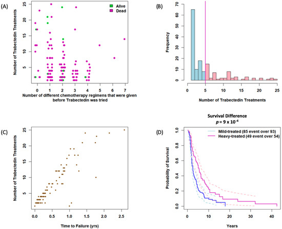 (A) Number of prior chemotherapy regimens vs. number of trabectedin treatments. (B) Number of patients with number of trabectedin treatments. (C) Number of trabectedin treatments until time of failure. (D) Survival in relation to number of trabectedin treatments in which mild-treated means fewer than 5 treatments while heavy-treated means 5 or more treatments with trabectedin.