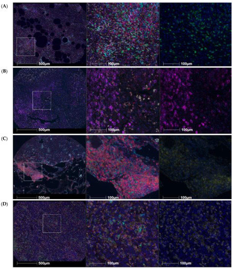 Tissue microarrays for sarcoma subtypes. CD8 (green), CD4 (red), PD-1 (yellow), PD-L1 (magenta), HLA-DR (cyan), CD68/CD163 (white), DAPI (blue). (A) Liposarcoma mIHC with high CD8 expression (green, far right). (B) Nonuterine leiomyosarcoma with high PD-L1 expression (magenta, far right). (C) Nonuterine leiomyosarcoma with high PD-1 expression (yellow, far right). (D) Synovial sarcoma with high PD-1 expression (yellow, far right).