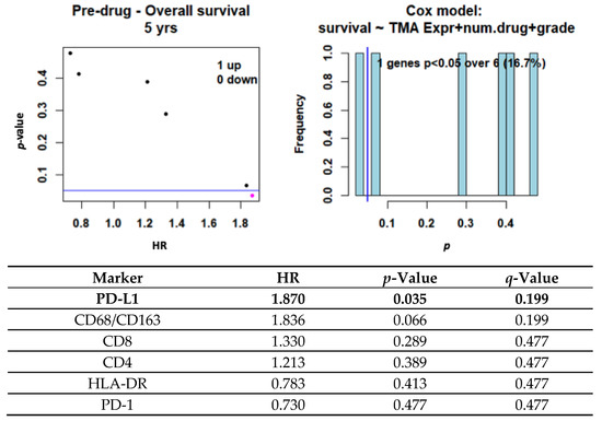 Using a Cox regression model, we performed univariate analysis investigating whether any pretreatment TMA staining pattern was associated with overall survival. Importantly, after 5 years of follow-up, increased PD-L1 expression corresponded to worse outcomes (HR = 1.87, p = 0.035, q = 0.199), as did macrophage infiltration (HR = 1.84, p = 0.066, q = 0.199) (Figure 3). Pearson pairwise correlations were performed for each cell marker after adjusting for tumor grade, but no single marker showed statistical significance in relation to time to trabectedin failure (Figure S5).