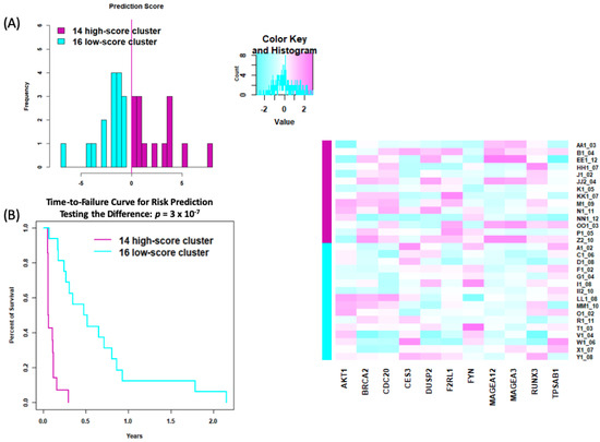 We analyzed gene expression of 750 genes from the NanoString 360IO assay using a Cox regression analysis on samples prior to trabectedin treatment. Of the genes analyzed, 53 were associated with time to trabectedin treatment failure, 28 genes with a positive association and 25 genes with a negative association (Figure S6). As demonstrated by others, we found using Pearson correlation test that SS and MRCL highly express cancer–testis (CT) antigens [15,16], specifically MAGEA3/A6 and MAGEA12. Further, low expression of both MAGE genes demonstrated favorable trabectedin treatment outcomes (correlation = −0.54, p = 0.003, q = 0.98; correlation = −0.52, p = 0.003, q = 0.98, respectively). High expression levels of AKT1 (p = 0.01), IFNGR1 (p = 0.01), and BRCA2 (p = 0.02) were predictive of early trabectedin treatment failure, irrespective of tumor grade. Lasso regression was used to further improve the interpretability of the marginal Cox model. Specifically, we looked to see from pretreated samples (N = 30) whether or not gene expression patterns might correlate to trabectedin response and, subsequently, to patient outcomes. The Cox lasso yielded 11 genes along with their regression coefficients. Applying these coefficients to the 11 genes of the original 30 samples, we obtained the predicted survival scores; then, based on these scores, we dichotomized the 30 samples into high-score group versus low-score group. We found that 11 of the previously mentioned 53 genes clustered to predict patient survival beyond 4 months (p < 0.001) (Figure 4).