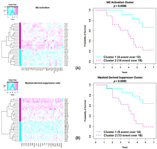 High expression levels of M2 macrophages and myeloid-derived suppressor cells correspond to a higher risk of death (log-rank p = 0.009 for both gene sets) (Figure 5).