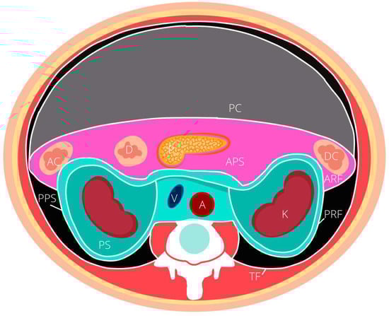 - Tirkes, T.; Sandrasegaran, K.; Patel, A.A.; Hollar, M.A.; Tejada, J.G.; Tann, M.; Akisik, F.M.; Lappas, J.C. Peritoneal and Retroperitoneal Anatomy and Its Relevance for Cross-Sectional Imaging. RadioGraphics 2012, 32, 437–451. [Google Scholar] [CrossRef]
