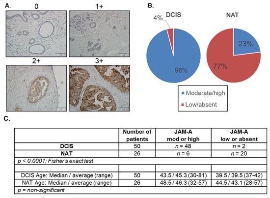 JAM-A expression in DCIS tumors exceeds that in normal breast tissue. (A) Membranous JAM-A expression was semi-quantitatively scored following immunohistochemical staining of a tissue microarray of DCIS patient cores or breast normal adjacent tissue (NAT). Representative images of 0 and 1+ scores were generated from NAT cores, while representative images of 2+ and 3+ scores were generated from DCIS cores (all 20× magnification). (B) JAM-A expression was noted as moderate/high (2+/3+) in 96% of DCIS cores compared to 23% of NAT cores (p < 0.0001). JAM-A staining of 0/1+ was categorized as absent/low. No trends in relation to patient age (C) were identified in this small sample set.