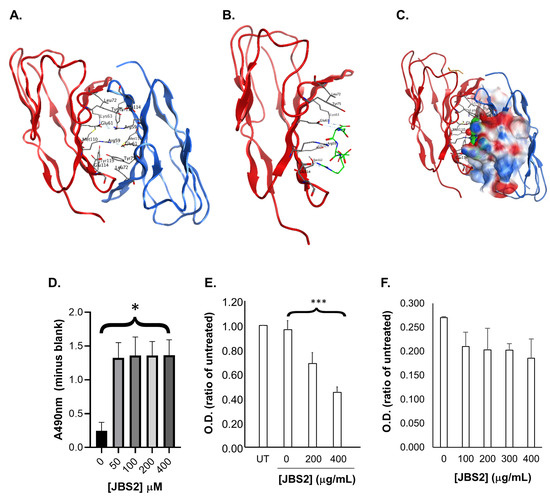 Peptide JBS2 binds to JAM-A and exerts anti-viability effects in vitro. (A) Crystal structure of the cis-dimer interface. Amino acid residues at the interface are displayed as sticks and colored according to element: oxygen is colored red, carbon grey, nitrogen blue, and serine yellow. (B) depicts the predicted binding pose for JBS2. The carbon atoms on the JBS2 peptide are colored in green. (C) presents an overlay of the JAM-A dimer and the predicted JBS2 binding pose. JBS2 is presented using space-fill with carbons colored in green. JBS2 was docked into the monomer with the red-colored ribbon. The surface of the interacting monomer is colored according to electrostatics (red, negative; blue, positive; and white, neutral). (D) Recombinant human JAM-A (1 ng) coated onto 96-well plates successfully captured biotinylated JBS2 peptide (50–400 mM; ~3–207 mg/mL) relative to wells without peptide (0 mM JBS2). Data represent mean ± SEM of n = 3 independent biological replicate experiments, and binding effects were concentration-independent (* p < 0.05). (E) SUM-225 cells grown on 96-well plates and treated for 2 × 72 h periods with the indicated concentrations of JBS2 or vehicle versus untreated cells (UT) were subjected to MTT viability assays. JBS2 exerted significant concentration-dependent reductions in cell viability. Data represent mean ± SEM of n = 3 independent biological replicate experiments; *** p < 0.001. (F) Primary breast cells isolated from a patient with high-grade DCIS were grown on 96-well plates, treated for 2 × 72 h periods with the indicated concentrations of JBS2 or vehicle, and subjected to MTT viability assays. Values shown are mean ± standard deviation of duplicate technical replicates in a single representative experiment. There was a trend towards reduced cell viability with JAM-A antagonism.
