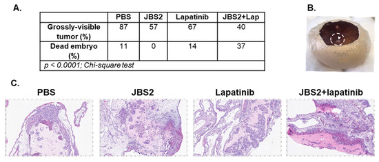 To begin interrogating the properties of JBS2+/−lapatinib in higher-order settings, an in vivo chick embryo xenograft model [26] was employed. JBS2 reduced the number of macroscopically visible tumors that grew on the chorioallantoic membrane (CAM) (Figure 3A), to a greater extent than lapatinib alone and a lesser extent than JBS2+lapatinib. However, JBS2 did not cause embryonic death, in contrast to lapatinib alone or particularly JBS2+lapatinib treatment (Figure 3A). A representative gross image of a xenograft tumor before excision from the CAM is shown in Figure 3B (white arrowhead; silicon ring annotated as dashed line). Haematoxylin and eosin staining of excised xenografts showed histologically similar tumors, where viable tumor remained (Figure 3C).