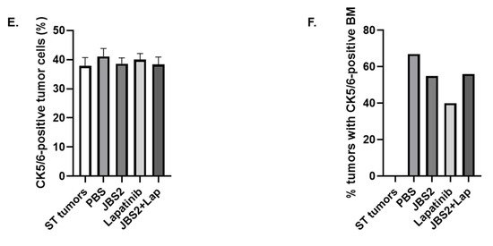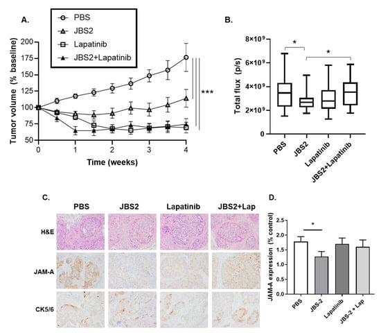 Analysis of weekly bioluminescence data revealed no simple relationship paralleling the volumetric measurements from Figure 4A. This may reflect falsely high values from necrotic tumors. Therefore, the data were represented as the mean of all bioluminescence measurements within each treatment group over the entire treatment period (weeks 1–4). As per Figure 4B, bioluminescence measurements confirmed that JBS2 significantly reduced mean tumor size relative to PBS-treated tumors (Figure 4B, * p < 0.05). The mean bioluminescence value of lapatinib was similar to that of JBS2, but this was not statistically significant. Interestingly, mean tumor bioluminescence for JBS2/lapatinib was similar to PBS controls and significantly exceeded that of JBS2 alone (Figure 4B). When tumors were stained for JAM-A and cytokeratin-5/6 (Figure 4C), quantification revealed that JBS2-treated tumors had significantly less JAM-A (Figure 4D) but not cytokeratin-5/6 expression (Figure 4E). However, the percentage of tumors with cytokeratin-5/6 positivity in the basement membrane (BM; a surrogate for tumor invasion) was reduced by treatment with either JBS2, lapatinib, or JBS2 + lapatinib (Figure 4F). In comparison, of nine sub-threshold (ST) tumors that did not reach a volume of 100 mm3 (and thus were not randomized into treatment groups), 100% were negative for cytokeratin-5/6 expression in the BM.