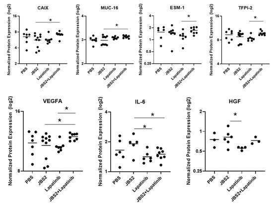 Proximity ligation assay technology was next utilized as an alternative screening tool to rank the most promising proteomic results from the mfp model for future study (Figure 5). Statistically speaking, a cut-off p-value < 0.05 was chosen for ranking, followed by individual one-way ANOVAs and the Benjamini–Hochberg method, recognizing that these would fail using a multiple ranking approach. Co-treatment with JBS2+lapatinib significantly increased the protein expression of carbonic anhydrase IX (CAIX) and Muc-16 (versus JBS2 alone) and increased that of ESM-1 and TFPI-2 (versus lapatinib alone) (Figure 5). Furthermore, lapatinib+/−JBS2 reduced the expression of IL-6 (versus JBS2 alone), and lapatinib + JBS2 increased that of VEGFA (versus either JBS2 or lapatinib). Finally, lapatinib reduced the expression level of hepatocyte growth factor (versus JBS2).
