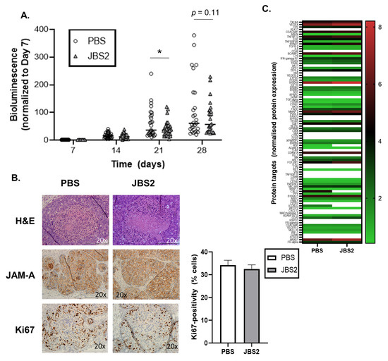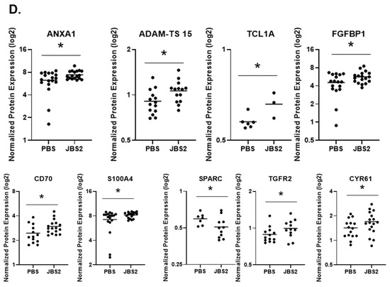 In the absence of definitive protein signaling signatures induced by JBS2 in mfp DCIS tumors, the drug was functionally tested in an independent in vivo model of DCIS. SUM-225-luc cells were injected intraductally into NSG mice, followed by direct intraductal injection of JBS2 or PBS on days 7, 14, and 21 in parallel with IVIS imaging on those days, as well as day 28. As shown (Figure 6A), tumor bioluminescence in JBS2-treated mice was less than that in control mice on days 21 and 28 (after, respectively, 2 and 3 once-weekly intraductal injections; * p < 0.05 on day 21, PBS versus JBS2). As observed, all tumors appeared to have high-grade DCIS with comedo-necrosis, moderate-strong JAM-A staining, and similar levels of Ki67-positivity (Figure 6B). Representative FFPE tumor extracts from both treatment groups on day 28 were next compared via proximity ligation proteomics. Although formalin fixation was not compatible with the detection of several proteins (Figure 6C, white lines), statistically significant differences between treatment groups were nonetheless noted for nine proteins (Figure 6D). Encouragingly, JBS2 treatment upregulated levels of the pro-apoptotic/anti-inflammatory protein annexin A1 (ANXA1) and the tumor suppressor ADAM-TS-15 and downregulated the EMT factor SPARC. However, by day 28 (at which time bioluminescence changes between control and treated groups had lost their statistical significance), JBS2 had also upregulated levels of the proto-oncogene TCL1A; the pro-angiogenic factors FGFBP1, CYR61, and S100A4; the co-stimulatory molecule CD70; and the EMT factor TGFR2.