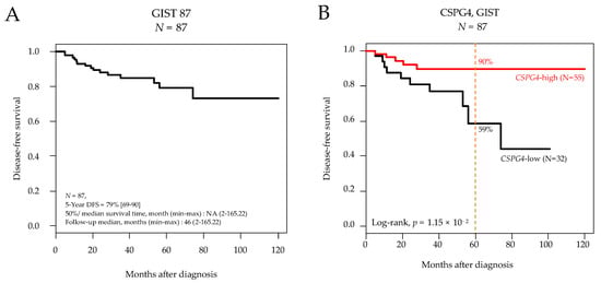 Disease-free survival in patients with localized GIST after surgery. (A) Kaplan-Meier DFS curves in the 87 informative patients for DFS. (B) Similar to (A), but according to CSPG4 expression (low and high). The p-value is for the log-rank test.