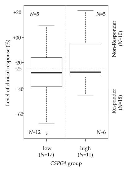 Correlation between CSPG4 expression and the response to imatinib. Correlation between the two CSPG4-based groups (high and low; N = 28) and the level of clinical response to neoadjuvant imatinib assessed as a continuous variable (box plot). The horizontal dashed line indicates the cut-off of tumor shrinkage that defines the responder status. The figures within the box plot indicate the number of patients in each of the four categories.