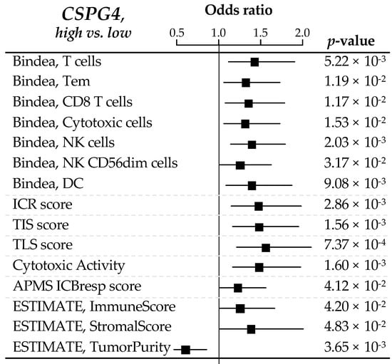 Correlations between CSPG4 expression and immune features. Forrest plot of correlations between CSPG4-high (left) and -low (right) expression and immune features, including the composition and functional orientation of the immune infiltrate according to the Bindea’s immunome, the Immunologic Constant of Rejection signature, T cell-inflamed signature (TIS) and tertiary lymphoid structures (TLS) enrichment signatures, the immune cytolytic activity score, the antigen processing/presentation machinery (APM) score, and ESTIMATE tool analysis for immune or stromal infiltrating cells. The p-values are for the logit link test.