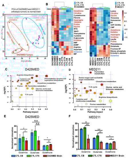 3.1. Orthotopic D425MED and MED211 Xenografts Showed Upregulation of Nucleotide Metabolism, Amino Acid, and Glutathione Synthesis