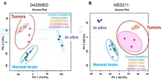 3.2. The Metabolic Profile of MYC-Amplified Medulloblastoma In Vitro Models Was Distinct from In Vivo Flank and Orthotopic Xenograft Tumor Models