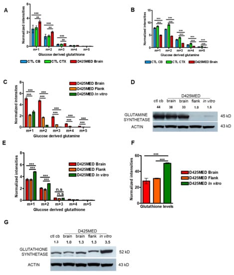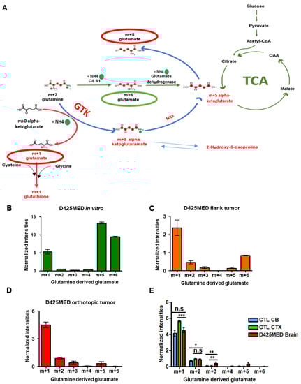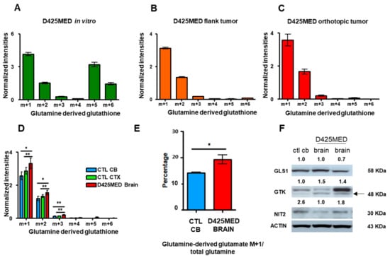 3.7. Glutamine Derived Glutathione Synthesis Was Mainly through GTK, and It Was Upregulated in Orthotopic D425MED High MYC Xenograft Tumors Compared to Normal Brain