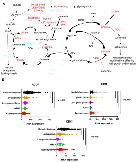 3.8. Overall Model of the Metabolomics of Orthotopic MYC-Amplified Medulloblastoma Reveals Key Dependencies That May Be Therapeutically Targetable