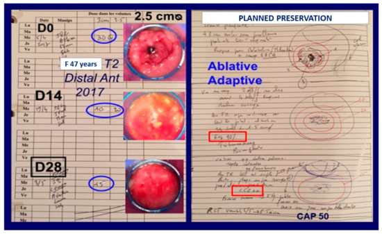 Illustration of tumor shrinkage during CXB treatment. Patient included (April 2017) in the OPERA trial in arm B1 (with CXB first). It was mainly an exophytic (polypoid) left-anterior tumor (knee–chest position: 5 to 8 o’clock). The rectoscope (blue) was 2.5 cm in diameter. Two weeks (D14) after 30 Gy (ablative dose) the tumor had shrunk by 95% and a small residual ulcer could be seen. The second fraction was given using two different applicators (adaptive strategy): a 3 cm diameter to deliver 10 Gy (in 40 s) and a second one 2.5 cm diameter delivering 20 Gy (in 1 min with a shorter FSD). Two weeks later (D28), a clinical complete response was observed. A dose of only 15 Gy (3 cm applicator) was given to the normal mucosa. One week later, chemoradiotherapy was initiated (45 Gy/5 weeks with concurrent capecitabine). Four years later in 2021, the patient is alive and well with good bowel function.