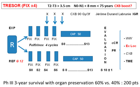 The results of OPERA at 3 years will be known in June 2022. If a benefit is observed, especially for small tumors treated with CXB first, planned organ preservation with a watch-and-wait approach when a cCR is observed could become standard and this option should be presented to the patients and discussed in a multi-disciplinary team (MDT) [18]. Total neoadjuvant treatment (TNT) is becoming popular for LARC after the OPERA, Rapido, Prodige 23, and GRECCAR 2–12 trials [19,20,21,22]. In France, before 75 years of age, Folfirinox (FIX) chemotherapy appears as an efficient (although sometimes aggressive) treatment for rectal adenocarcinoma [21,22] although so far no adjuvant or TNT has ever been shown to increase overall survival in rectal adenocarcinoma. To try to increase the chance of a planned OP in T2–T3 > 3 cm ᴓ, the TRESOR trial is under ongoing discussion in France. The reference (control) arm could be, according to GRECCAR 12, four (or six) cycles of FIX induction followed by CRT (CAP 50) and, depending on the tumor response assessment, TME in the case of partial response or W&W in the case of a cCR. Local excision could also be an option in the case of an ncCR. The experimental arm will be the same, with the addition of a CXB boost 90–110 Gy/3–4 fr/4–6 weeks delivered after FIX cycle 2 and concurrent with cycles 3–4. Adjuvant chemotherapy as in Prodige 23 is under discussion. The endpoint will be to increase the 3-year overall survival TME free from 45% to 65% and 200 patients should be included (Figure 4).