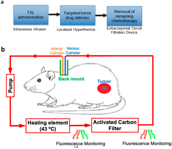 The more recent TSL formulations are based on the intravascular triggered release paradigm, where drug release from TSL occurs while blood carrying the TSL pass through the tumor vasculature [19,20,21,22]. The released drug is then taken up by the tumor tissue. Importantly, the release and uptake of the drug take place only while hyperthermia is applied, with negligible tumor drug uptake after hyperthermia completion (Figure S1) [20,21,23]. Typically, a significant fraction of encapsulated TSL-Dox is still in circulation after hyperthermia is completed [18,24]. Therefore, intravascular triggered nanoparticles such TSL-Dox enable a new strategy to potentially reduce toxicities without impacting therapeutic efficacy by removal of this remaining TSL-Dox in circulation after tumor delivery by hyperthermia.