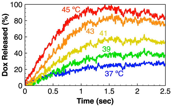 Figure 2 shows doxorubicin release from TSL between 37 and 45 °C during the first 2.5 s, indicating that the majority of the drug was released within <2 s above 43 °C. At 37 °C, approximately 30% of the drug was released.