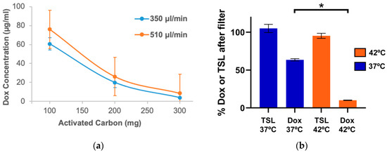 In vitro studies with an activated carbon filter. (a) Free Dox solution (2 mL in PBS @ 100 µg/mL concentration) was pumped through activated carbon filters (ACF) filled with 100, 200, and 300 mg activated carbon, at flow rates of 350 and 510 µL/min. The graph indicates Dox concentration after filter for the various conditions. (b) TSL-Dox solution (2 mL in PBS @ 100 µg/mL concentration) was passed first through the heating element set at either 37 °C or 42 °C, and then through the filter (300 mg, 350 µL/min). 36.4 ± 1.6% of Dox was removed at 37 °C, and 89.1 ± 0.3% was removed at 42 °C (p < 0.05). (n = 3 per experimental group). In addition, fluorescence-labeled empty TSL in PBS was passed through the filter after being heated to 37 °C or 42 °C. Contrary to Dox, no significant removal of TSL was observed. These results indicate that only free drug is removed by the filter. Error bars indicate standard deviation. Asterisk (*) indicates significance (p < 0.05).