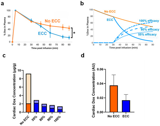 (a) Norway brown rats were infused with TSL-Dox (7 mg/kg) and were stratified into two groups (ECC starting at 30 min, and No ECC). In the group without ECC, the half-life of the TSL-Dox was found to be 57.3 ± 20.2 min. In the ECC group, there was a rapid drop in the concentration of the drug once the ECC was established. 29.7 ± 3.7% of the infused dose was removed from the systemic circulation due to ECC. Error bars indicate standard deviation. Asterisk (*) indicates significance (p < 0.05) (b) Computer model results showing plasma Dox concentration with, and without ECC (solid lines). In addition, % removed Dox (relative to infused dose) is shown (dashed lines), assuming filters with either 55% efficacy (similar to in vivo), 80%, and 100% efficacy. At 55% filter efficacy (average efficacy of filter used in vivo), 33.7% of the infused dose was removed. The AUC calculated between time = 0 and infinity was 40.6%*h for the ‘ECC’ case and 14.2%*h for the ‘No ECC’ case. (c) Computer model results showing cardiac Dox concentration of encapsulated (light) and unencapsulated/free drug (dark). Results are shown without ECC (orange) and with ECC assuming filter efficacies between 55–100%. (d) Relative quantification of cardiac Dox concentration measured in rat hearts from in vivo studies (n = 3/group). Difference in cardiac Dox uptake did not reach statistical significance (p = 0.13).