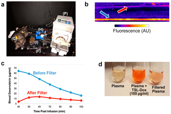 Fluorescence monitoring during filtration. (a) ECC set up within the imaging chamber showing rat with vascular catheters (C), heating element (H), pump (P), filter (F), and imaging module (I) containing capillary tubes (capillary tubes are at the bottom, as imaging was conducted from below). (b) Fluorescent imaging of capillary tubes in the imaging module during ECC shows the much higher fluorescence of blood before the filter (blue arrow) compared to after the filter (red arrow). (c) ECC filtration was initiated 40 min after drug infusion, and drug removal was monitored based on fluorescence imaging of blood in the capillary tubes (see b). (d) Plasma samples from the animal, before infusion of TSL-Dox (background), after infusion, and after filtration.