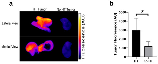 Tumor fluorescence of heated and unheated tumors. Immediately after ECC, animals were sacrificed, tumors harvested, and subjected to fluorescence imaging to visualize Dox distribution. (a) Enhanced tumor fluorescence of tumors exposed to hyperthermia (HT) indicates localized drug delivery from TSL-Dox. (b) Mean fluorescence of heated tumors was ~2.6× higher than for unheated tumors (n = 4/group). Asterisk (*) indicates significance (p < 0.05).