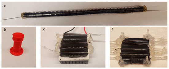 For fabrication of the heating element, a Peltier module (Digi key, Inc., Thief River Falls, MN, USA, 6A input) of 4 cm × 4 cm size was glued with one side (cooled side) to an aluminum heat sink via thermally conductive epoxy resin (MG Chemicals, Surrey, BC, Canada). The surfaces were then allowed to air dry at room temperature for 2 h. Subsequently, a copper plate (4 cm × 4 cm × 0.2 cm) was glued to the second side (heated side) of the Peltier module with the thermally conductive epoxy resin, to ensure uniform surface temperature [42]. The glass capillary tubes (4 cm, 0.58 mm inner diameter, Accu-Glass, LLC, St. Louis, MO, USA) were then connected using polyurethane tubes to form a continuous flow channel. The capillary tubes were glued to the copper surface by a thin layer of thermally conductive epoxy resin and left to dry at room temperature for 24 h (Figure 7c). At a flow rate of 0.35 mL/min, the fluid (e.g., blood) spends ~5 s within the capillary tubes of the heating element, considering the inner diameter and length of the tubes. Temperature control of the Peltier element was performed using a customized proportional-integral (PI) control algorithm that controlled the voltage applied from a DC power supply to the Peltier element as described earlier [43].