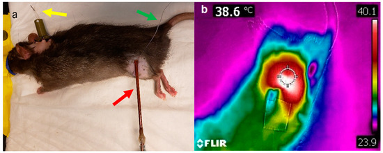 Tumor hyperthermia was performed by using a directional microwave applicator, as previously described [46]. A thermocouple was placed under the skin and above the tumor. Ultrasound gel was applied on top of the skin to ensure good dielectric contact with the microwave probe (Figure 8a). The tumor was then heated using the microwave probe to achieve a target temperature of 43 °C (measured by the thermocouple placed under the skin) for 15 min. Tumor surface temperature was also measured using an infrared camera (FLIR® Systems Inc., Wilsonville, OR, USA) at the end of hyperthermia (Figure 8b).