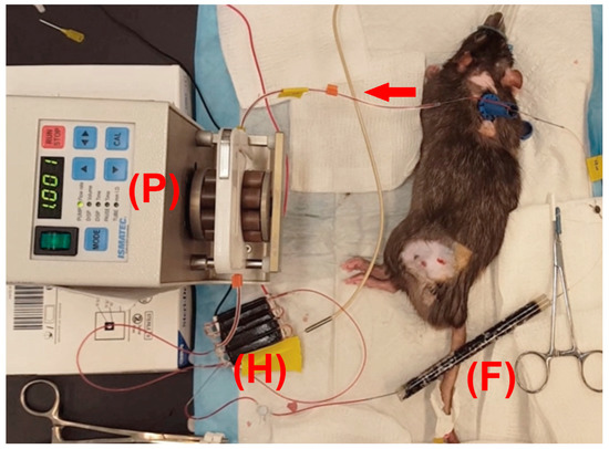 Experimental setup of ECC in rats. Blood from the carotid artery was pumped by a pump (P) through the heating element (H) set at 43 °C, then through the activated carbon filter (F), and finally returned to the animal through the jugular vein. Red arrow indicates direction of blood flow.