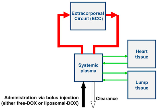 Overview of computer model. The model was adapted from a prior publication [20], with addition of the extracorporeal circuit (ECC) as indicated. For comparison to experimental results, systemic plasma Dox concentration was calculated with and without ECC filtration. In addition, Dox uptake by the heart was estimated as surrogate for cardiotoxicity.
