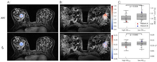 Examples of and maps in two patients. One with a high molecular hypoxia score () (A) and one with a low (B). The median and for all tumors with a low are shown against the tumors with a high in (C).