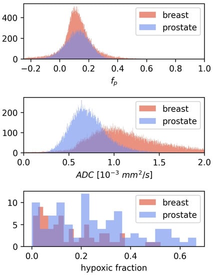 The distribution of and for all voxels in the 3D breast tumor volumes, together with the corresponding distributions from the prostate cohort from Hompland et al. [7]. Median and in the breast cancer tumors were mm/s and respectively, compared to mm/s and in prostate cancer [7].