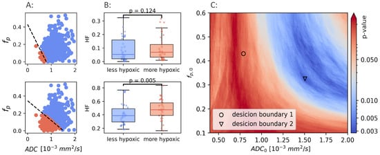 The Mann-Whitney p-values for all combinations of and are shown in Figure 4C. There exists a range of and that gives decision boundaries with an ability to separate hypoxic and non-hypoxic tumors that is better than both and alone (). The best separation () was found for mm/s, and .