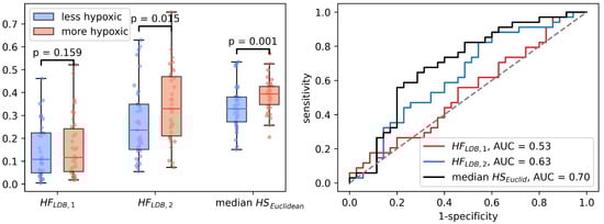 Three different ways of estimating hypoxia in breast cancer using the CSH method. is hypoxic fraction, calculated using the same model, with the same model-parameters as Hompland et al. used in prostate cancer. is hypoxic fraction calculated using the Hompland model, but with adapted model parameters, and median is the median hypoxia score, calculated by Equation (5). Area under the reciever operateor characteristic curves for all three approaches are shown to the right.