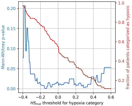 Mann-Whitney p-value (blue) for hypoxia stratification thresholds ranging from to . The resulting fractions of patient stratified as hypoxic for the thresholds are displayed in red.