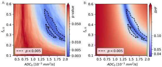 It is clear that a combination of and , trained and optimized in prostate cancer to identify hypoxia, do not identify hypoxia in breast cancer. If a CSH model capable of identifying hypoxia in breast exists, a retraining for the new cancer type is required. Using the hypoxia reference () as ground truth, the potential results obtained from model retraining were examined. Hypoxic fractions were calculated using a range of decision boundaries, obtained from different combinations of and . For each decision boundary, the Mann-Whitney p-value was calculated, and used as a measure of the ability of the model to separate between hypoxic and non-hypoxic tumors. p-values were calculated for ranging from to 2, and ranging from to . Figure 4 illustrates how two different decision boundaries look in one single patient (A) and in the entire patient cohort (B).