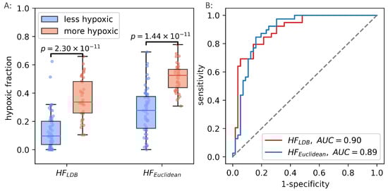 Hypoxic fractions in prostate cancer calculated using the original linear decision boundary() from Hompland et al., and the hypoxic fraction calculated using the unsupervised (Euclidean) method () (A). Area under the reciever operating characteristic curve for the two methods (B).