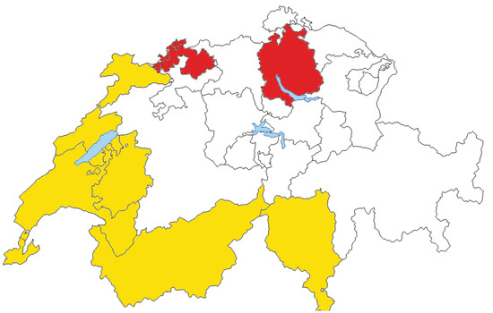Swiss regions (cantons) participating in the study. Swiss-Latin cantons, including Swiss-Italian and Swiss-French, are depicted in yellow. Swiss-German cantons are depicted in red.