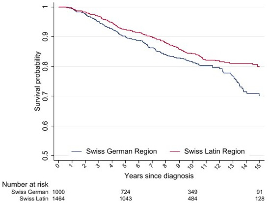The linguistic-geographic regions were created by dividing the cantons into two groups representing the two main Swiss language regions (Basel and Zurich in the German region and all the remaining ones in the Latin (French/Italian) region), as previous reports have shown differences in cancer risk avoidance behaviors, use of health care services, and socioeconomic status in the two regions [13,16]. The attribution to the linguistic-geographic region was determined based on the residence of the patient at the time of diagnosis and it was considered to be unrelated to the place of birth or nationality.