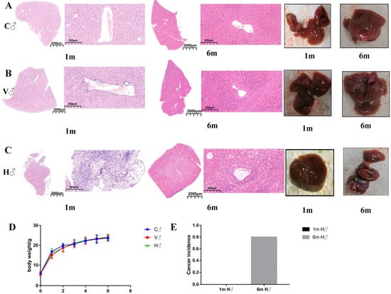 The removed mouse liver tissue was immersed in 4% paraformaldehyde, embedded in paraffin after being fixed for a period of time, and cut into 5–6 μm paraffin sections with a microtome (Leica, Shanghai, China). The obtained paraffin sections were stained with hematoxylin and eosin (HE), and finally the whole field of view was scanned by Nikon optical microscope (Nikon, Tokyo, Japan) and the field of view was photographed under a 200× microscope. The calculation method of the incidence of cancer is to count the number of mice in group H whose liver tissue has obvious tumor formation under HE. For example, 1 month after administration, we dissected 5 WT male mice, and no mice developed tumors. The incidence of cancer was 0. Then, 6 months after administration, we dissected 5 male WT mice, 4 mice had obvious tumor formation by HE staining, and 1 had no evident change. We calculated that the cancer incidence rate was 80%.