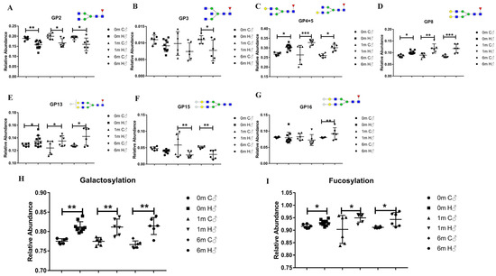 The changes in the serum IgG glycans between groups H and C at the three time points of 0, 1, and 6 months after administration during the cancer induction process in male mice, which indicated the relative abundance of galactosylation and that some IgG-N glycans are highly correlated with HCC. (A) GP2 in group H was lower than it was in group C at all three time points. (B) GP3 only decreased in group H at 6 months. (C) The sum of the relative abundances of GP4 and GP5 in group H was higher than it was in group C at all three time points. (D) GP8 in group H was higher than it was in group C at all three time points. (E) GP13 in group H was higher than in was in group C at all three time points. (F) GP15 decreased at 1 and 6 months. (G) GP16 only increased at 6 months. (H) Galactosylation in group H was higher than it was in group C at all three time points. (I) Fucosylation in group H was higher than it was in group C at all three time points. Structural symbols: blue square: N-acetylglucosamine; green circle: mannose; red triangle: fucose; yellow circle: galactose; white diamond: N-glycolylneuraminic acid. Data are expressed as mean ± SD. * p < 0.05, ** p <0.01, *** p <0.001. (C—control WT group; H—HCC WT group; 0 m/1 m/6 m—0 month/1 month/6 months after administration; ♂—male mice).