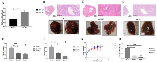 Confirming the success of the HCC model is a critical step. At 1 month after administration (1 m), HE staining was performed. It was found that the histology of the WT blank control group (C) and WT solvent control group (V) were normal. Although the WT mice with DEN/CCl4 administration group (H) had evident vacuolar degeneration, no evident cancerous sites were found. Histopathological analyses were performed again 6 months after administration (6 m). Groups 6m C and V showed normal results. Since no differences were observed in the liver tissue samples between groups C and V, they will no longer be distinguished from each other in the following research results. However, group 6m H showed obvious tumor nodules. Both the representative total appearance and HE staining revealed that the liver structure was disordered and that the observed vacuolar degeneration was serious (Figure 1A–C). The liver is part of the digestive system. By monitoring the weight after DEN treatment and each cycle of CCl4 administration, it was found that there were no significant changes in body weight, which confirmed that there was no relationship between medication and body weight during the model period (Figure 1D). At 1 month after administration, cancer incidence was 0, but it was 80% 6 months after administration (Figure 1E).
