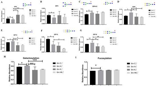 B-cell-specific ablation of B4GALT1 reduces the level of serum IgG galactosylation in HCC and reverses the changes induced in galactose-related glycans in HCC. (A) B-cell-specific ablation of B4GALT1 and systemic knockout of B4GALT1 both reversed the changes in the relative abundance of GP2. (B) B-cell-specific ablation of B4GALT1 and systemic knockout of B4GALT1 do not affect the relative abundance of GP3. (C) B-cell-specific ablation reverses the changes observed in the sum of the relative abundances of GP4 and GP5. (D) B-cell-specific ablation of B4GALT1 and systemic knockout of B4GALT1 both reversed the changes in the relative abundance of GP8. (E) B-cell-specific ablation of B4GALT1 and systemic knockout of B4GALT1 both reversed the changes in the relative abundance of GP13. (F) Systemic knockout of B4GALT1 promoted changes in the relative abundance of GP15. (G) B-cell-specific ablation of B4GALT1 and systemic knockout of B4GALT1 both reversed changes in the relative abundance of GP16. (H) B-cell-specific ablation of B4GALT1 and systemic knockout of B4GALT1 both reversed changes in the relative abundance of galactosylation. (I) B-cell-specific ablation of B4GALT1 and systemic knockout of B4GALT1 did not affect the relative abundance of fucosylation. Structural symbols are the same as Figure 2. Data are expressed as mean ± SD. * p < 0.05, ** p < 0.01, *** p < 0.001. (C—control WT group; H—HCC WT group; HK—HCC B4GALT1+/− group; K—HCC CD19-cre+/− B4GALT1flox/flox group; 6 m—6 months after administration; ♂—male mice).