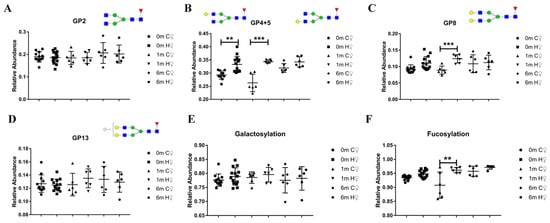 Female mice have a lower cancer incidence do not have the same stable IgG glycan changes as male mice, who have a higher high cancer incidence. (A) The relative abundance of GP2 in female mice does not change during the cancer induction process. (B) The sum of the relative abundances of GP4 and GP5 in female mice does not change regularly during the cancer induction process. (C) The relative abundance of GP8 in female mice only showed a decrease after the first month of the cancer induction process. (D) The relative abundance of GP13 in female mice did not change during the cancer induction process. (E) The relative abundance of galactosylation in female mice did not change during the cancer induction cases. (F) The relative abundance of fucosylation in female mice only showed a decrease one month after the initiation of the cancer induction process. Structural symbols are the same as Figure 2. Data are expressed as mean ± SD. ** p <0.01, *** p <0.001. (C—control WT group; H—HCC WT group; 0 m/1 m/6 m —0 month/1 month/6 months after administration; ♀—female mice).