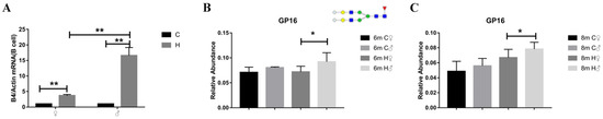Previous studies have mentioned that serum IgG glycans are closely related to cancer; however, how the IgG glycans change throughout the HCC formation process remains unknown. After confirming the successful HCC induction, we began to explore the changes in serum IgG glycans at multiple time points during the cancer induction process in mice. We first analyzed 16 glycan UPLC peaks characterized in our previous work [17] at different time points in detail during the HCC induction process. The IgG glycan components and structure corresponding to the 16 glycan peaks are shown in Figure S1. As shown in Figure 2A–G, eight glycans were found to have been altered during HCC induction, including GP2, 3, 4, 5, 8, 13, 15, and 16. Among them, three glycans were decreased in group H, and they were found to have no terminal galactose (GP2 and 3) or no core fucose (GP15), while the other five glycans in group H that were shown to have increased are all fucosylated with a terminal galactose or sialic acid. Considering the fact that GP4 and GP5 are isomers with little overlap in chromatography and because they show similar change trends, we added them together in the following experiments to achieve better accuracy. When considering these IgG glycans over the course of HCC progression, it can be seen that some glycans changed at all three investigated time points, including GP2, 4, 5, 8, and 13, while others only changed at later stages in the induction process (Figure 2 and Table 1). All of the changes observed in the glycans reflect the increased levels of the galactosylation and fucosylation of the glycans in group H (Figure 2H,I). Both of them showed steady changes at the three time points; however, the galactosylation changes are more prominent (Figure 2 and Table 1). All of the above results indicate that the galactosylation of serum IgG and the related glycans were highly correlated with HCC, which is the focus of the following sections. The letters in Table 1 can be explained as follows: A, N-acetylglucosamine; B, bisecting structure; F, fucose; G, galactose; M, mannose; S, sialic acid.