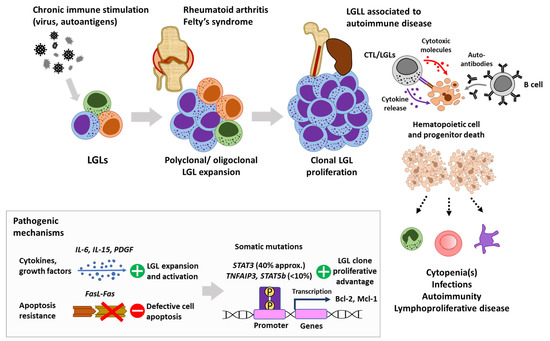 The diagnosis of LGLL, according to the 2016 classification of the World Health Organization (WHO), is based on a persistent (>6 months) increase in the number of LGL cells in peripheral blood (PB), usually 2–20 × 109/L, without an identifiable cause. The WHO update has not introduced relevant changes in the diagnosis of this entity, and the division is maintained, according to the lineage of origin of the leukemic cell, in LGLL of T lymphocytes (T-LGLL, 85% of cases) and chronic lymphoproliferative disease of NK cells (CLPD-NK). The molecular hallmark of LGLL is the mutation of STAT3 and other genes associated with the JAK/STAT pathway. Treatment is based on immunosuppressive therapy (methotrexate, cyclophosphamide, etc.), and it might enable disease control and long-term survival, but not leukemic clone eradication. Beyond the presence of characteristic clinical and hematological signs, such as neutropenia or anemia, LGLL has been associated with an array of conditions/disorders [4].