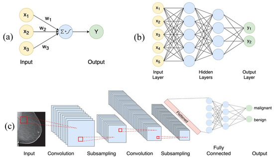 (a): Neuron, the fundamental computational unit of a neural network, computes the weighted sum of its inputs (X1, X2, X3) and applies a non-linear operation to give output (Y). (b): An example of a feedforward neural network with two hidden layers, with five and four neurons, respectively. (c): An example of a convolutional neural network (CNN) applied to the classification of a screening mammogram as probable malignant or benign.